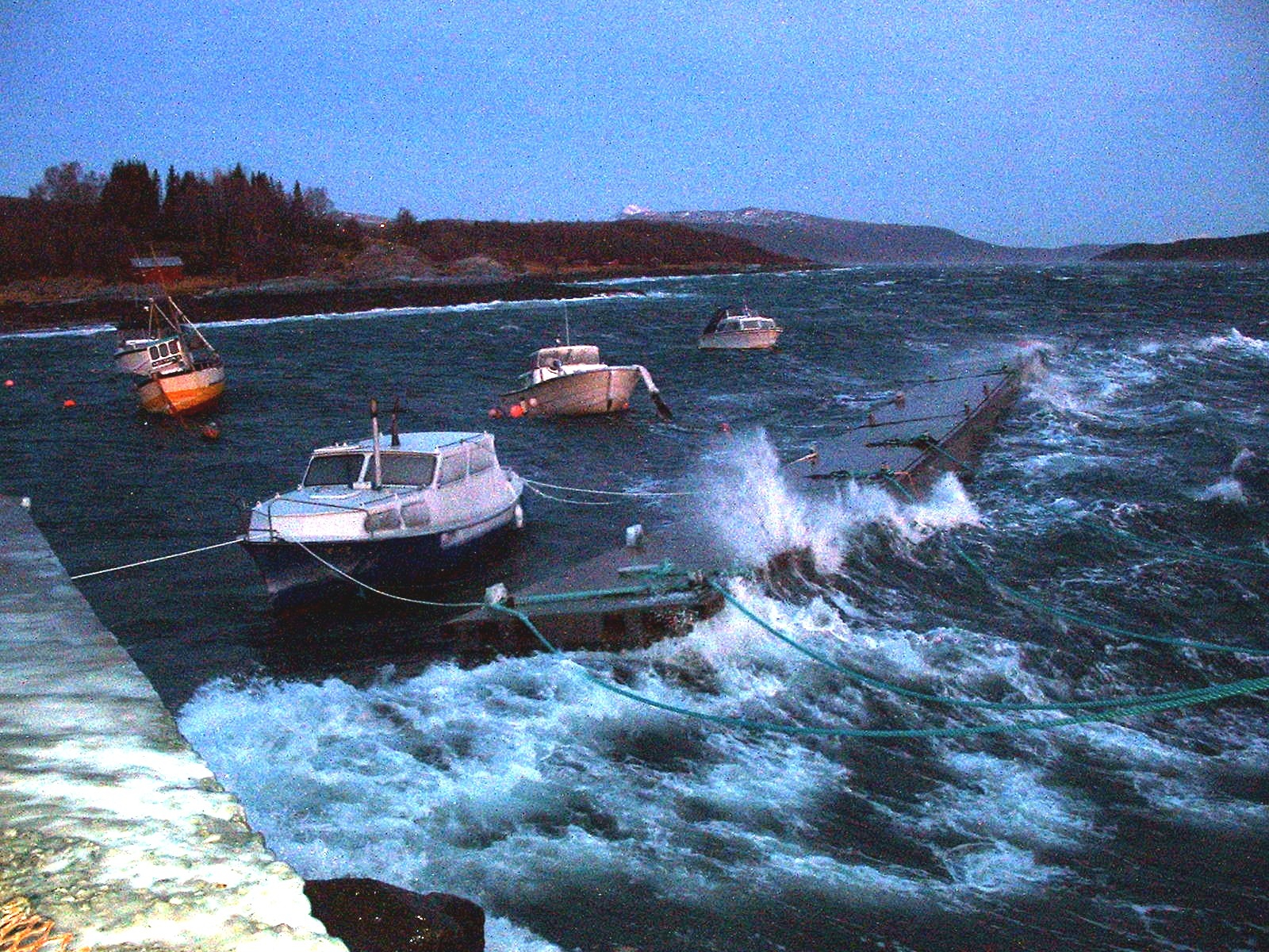 Den nye flytemoloen på Hellandsberg kom til sin rett i austavindskulingen torsdag morgen der vindstyrken kom opp i storms styrke i perioder. En stund så det noe dramatisk ut da begge boltene til landkjettingene i den innerste betongbrygga gikk av, men båtforeningens medlemmer sørget for å få det hele under kontroll med å ro ut kraftige tamper. Ennå torsdag formiddag var det hele under kontroll.