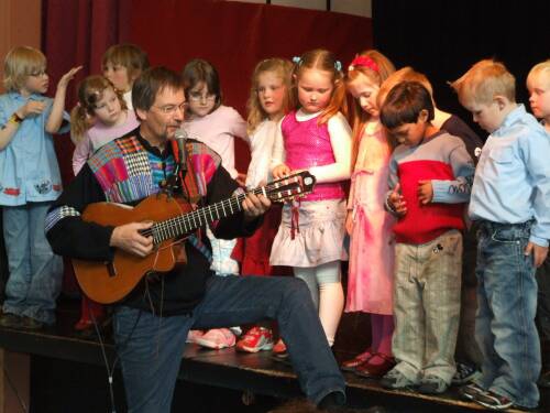 Tirsdag var visesangeren Geirr Lystrup i Steigen. Han hadde konsert på sentralskola i Leinesfjord med et 20-tall barnehageunger som medsangere.