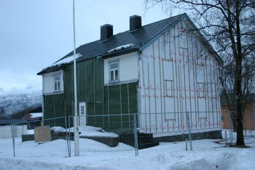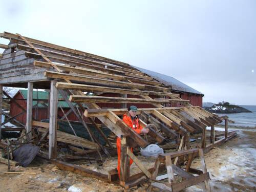 På en gammel grunnmur – og med en halv original i enden - setter Harald Hansen (60) i disse dager opp et fembøringsnaust like ved havna i Langnesvika i Steigen.