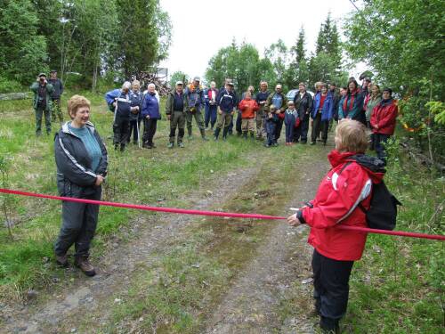 Ordfører Berit Woie Berg skar over snora og markerte dermed den offisielle åpningen av Follstranda turområde ved Kjærlighetskroken sist søndag. Til venstre står Henriette Hansen, leder i IL Løken.