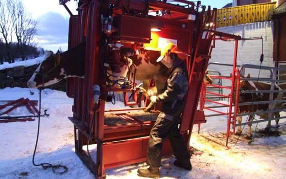 Tore Håkstad fra Bardu i Troms har gjort klauvskjæring til helårs beskjeftigelse. Med avansert utstyr reiser han fra Salten i sør til Alta i nord og steller klauvene til kyrne.