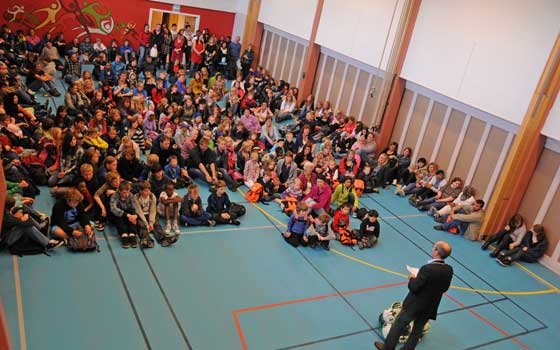 SkoleLærere, foresatte og 170 spente elever var samlet i gymsalen da sentralskolen i Leinesfjord åpnet dørene for første skoleår etter halvannet år med renovering.
