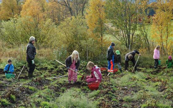 Skole2. til 4.klasse fra Innhavet skole har nå høstet årets poteter, i skolehagen på Øverås Gård.