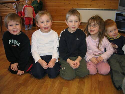 Dag Hugo, Tobias, Lasse, Frøya og Fredrik i barnehagen på Storjord hjelper andre barn gjennom sin årlige kafé.